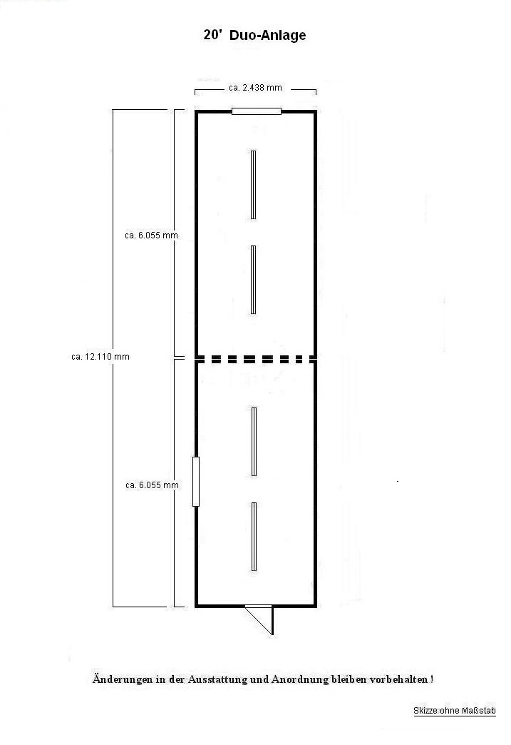 • Außenmaße ca.: Länge: 12.110 mm x Breite: 2.440 mm x Höhe: 2.600 mm / 2.800 mm