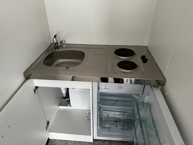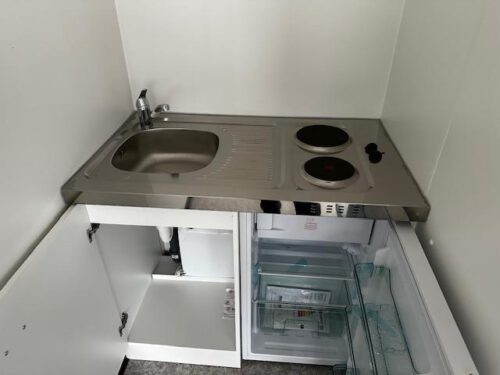 – 1x Kleinküche inkl. E-Doppelkochfeld, Spülbecken mit Armatur und Kühlschrank,